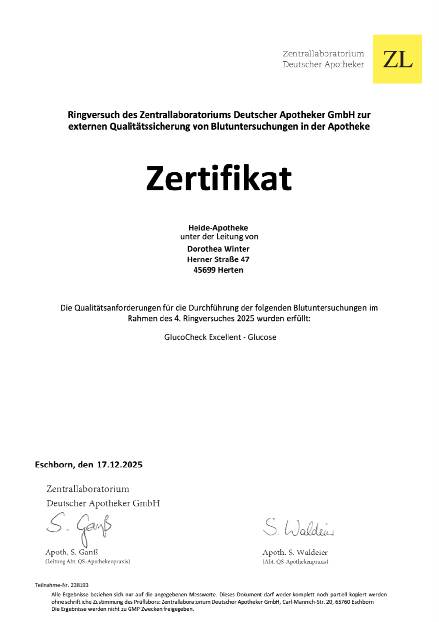 Die aktuellen Zertifikate hängen in unserem Beratungszimmer. Weiterhin lassen wir die Beratungsaktivität der Mitarbeiter und die Planungsaktivitäten des Chefs von der Apothekerkammer Westfalen-Lippe prüfen.