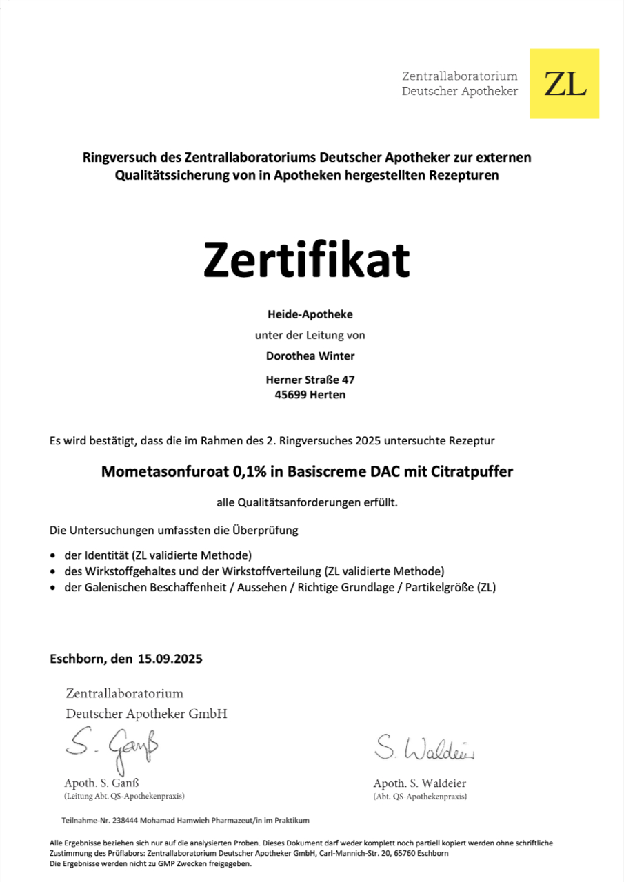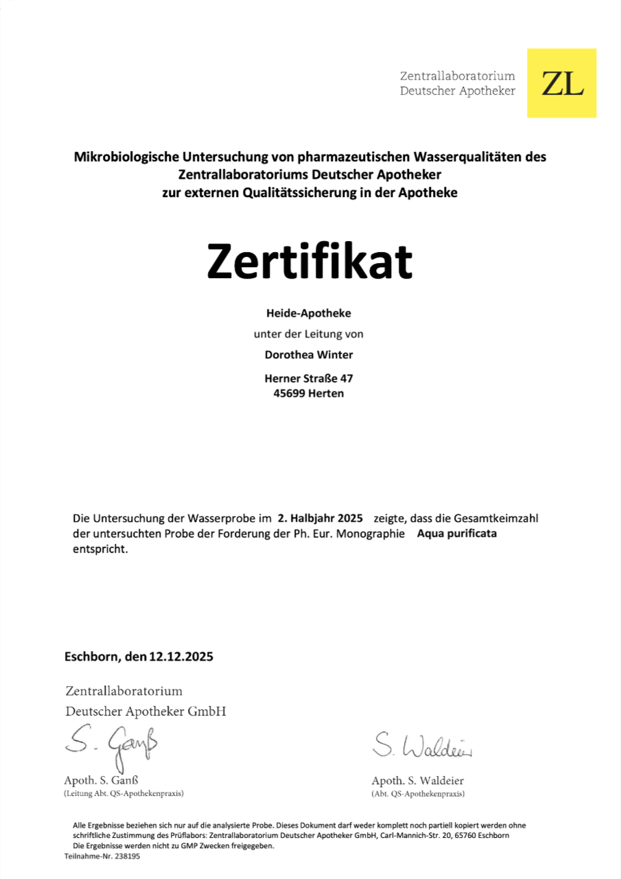Als zertifizierte Apotheke in Herten lassen wir uns freiwillig von externen Firmen in gewissen Zeitabständen überprüfen, um die Qualität unserer Produkte und Dienstleistungen für Sie als Kunde sicherzustellen. Zum Beispiel wird ein Mal jährlich die Qualität des Wassers zu Rezepturzwecken und die Qualität von selbst hergestellten Arzneimitteln überprüft.